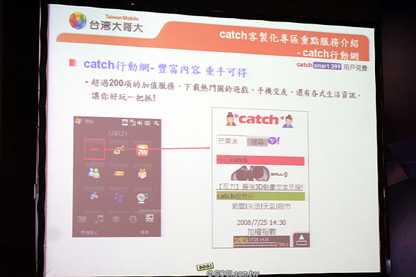 ▲ 由於 P3702 和台哥大進行客製化服務,所以應用程式中也加入了「catch」選項,供使用者連上加值網頁下載服務或是圖鈴。