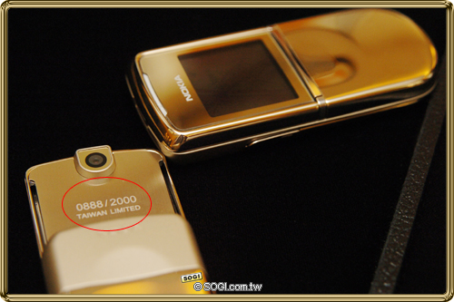 目前進駐於台北微風廣場 2 樓中庭的 Nokia 8800 Sirocco Gold 18K 金限量典藏版,首賣進駐時間從今日起至 5 月 6 日為止,想要搶先擁有並選號的消費者可自行至台北微風廣場首賣專區進行預先下訂單與付款的動作,在下訂單的同時還可以自行挑選滑蓋機身背後之專屬認證號碼 ( 上圖紅圈處 ),三天內免費送貨到府。不過要特別注意的是,選號僅限於台北微風廣場 2 樓中庭之專區處,5 月 7 日起,全省舖貨之後將無法進行選號。