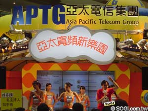 亞太電信集團 APTG在這次的台北電信展是以「亞太寬頻新樂園」 為主題,整合了亞太行動寬頻、亞太固網寬頻及亞太線上三家公司的主力產品共同參展, 精心打造全方位寬頻多媒體「亞太寬頻星球」, 針對企業及個人市場的不同需求,推出整合性服務。
