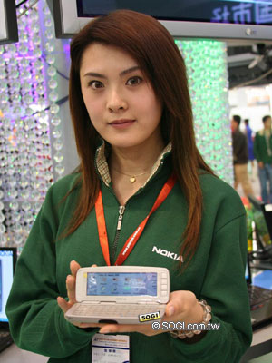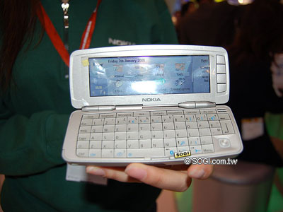 外型超特別的頂級系列 Nokia 9300 也現身會場,展示小姐直接將手機翻開,乍看還像一台小電腦。內建 Symbian 9.0 平台,可執行常用的商務功能,並可外至 1GB 的 MMC 記憶卡。