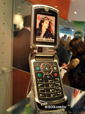 MOTOROLA V1150也是此次MOTO展場一大焦點,外型與2004年MOTO旗艦風雲機V3極為類似,僅有1.9公分的機身厚度,比V3厚了一點點,因為它可是加入許多功能呢!V1150在照相部分較前輩 V3 的 30 萬畫素相機大為進步,外側的相機是 200 萬畫素,內側的視訊通話相機則是 30 萬畫素,用於 3G 影像電話的雙向溝通最方便,畢竟 V1150 是支援 WCDMA 的 3G 手機。相機還支援八倍數位變焦以及近拍模式,V1150迷你輕薄,同時又兼具功能,將帶給消費者又一個全新的體驗。