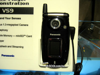 Panasonic VS9 和其他 Panasonic 所展出的手機,外型上有很大的不同,只有 VS9 有天線,小編認為應該是避免 3G 開台初期收訊不良,因此天線並無隱藏起來,讓收訊的狀況比較理想。Panasonic VS9 支援 WCDMA / GSM 的雙模機,有著雙彩色螢幕以及雙鏡頭,分別是 130 萬畫素 CCD 以及 10 萬畫素 CMOS,可以用 SD 卡來擴充記憶體。