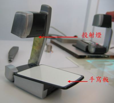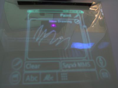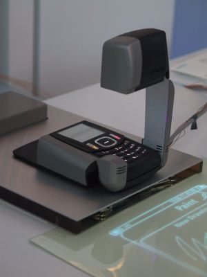這個不知型號,感覺像是剛從工廠拿出來有,有點像手機又不太像的東西,是在西門子的一個「Enter the Further」所發現的,它一支配有「觸控式投影機」的手機,可以把螢幕的影像透過內建的投影功能顯示在任何平面上,再配合手寫筆在平面上使用,當做成「觸控式螢幕」,也可以在上面寫字,甚至可以把手機裡面的影片投影放大出來(目前只有單色階)。