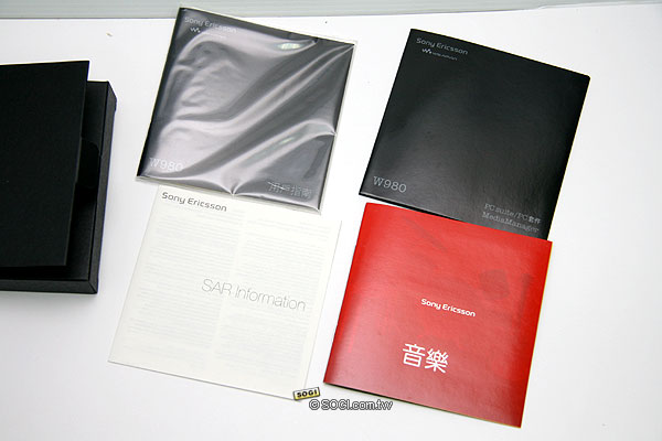 ▲ 手機說明書、Walkman 說明書、SAR 資訊以及 W980 傳輸光碟和軟體