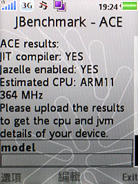 ARM 與 Jbenchmark 合作開發的測試程式「ARM CPU Estimator(ACE)」,可測試手機的處理器與 Java 效能,CPU 資訊以及圖表。測試的方法非常簡單,只要將 ACE 程式傳到手機或記憶卡當中,打開程式在手機上安裝即可。安裝完成後,打開 ACE 應用程式檔案並執行,即可就可以看到如 CPU Family、時脈與 Java 效能圖表等資訊。