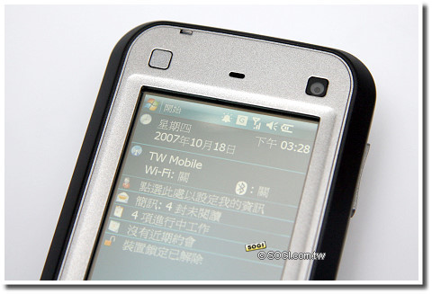 TOSHIBA G900 的正面與一般微軟 PDA 手機相去不遠,偌大的觸控螢幕與五向操作鍵,都是 PDA Phone 的一大特色,不過讀者可能會發現,G900 的螢幕「似乎」比一般 PDA 手機長了不少,G900 所配置的螢幕,正是微軟Windows Mobile 6 最新支援的 3 吋 WVGA 解析度,具有 800×480 的顯示畫素,比起一般 VGA 顯示的 640×480 畫素還寬大了不少。