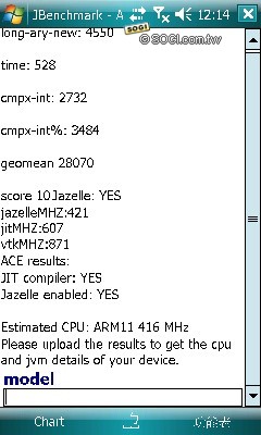 結果顯示,TOSHIBA G900 屬於 ARM11 系列,執行時脈為 416MHz,支援 Jazelle 硬體 Java 加速。