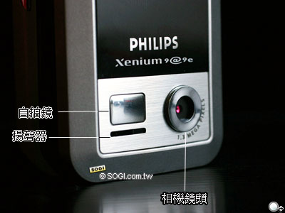 philips xenium 9@9e 內建 130 萬畫素相機功能,鏡頭位置設計在機身正面右下方,在鏡頭的正左邊則有一個長方形的自拍鏡與一條小橫條形狀之立體揚聲器。