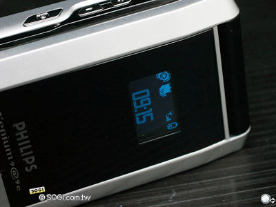 為了讓手機保持省電的最佳狀態,philips xenium 9@9e 捨棄彩色雙螢幕的設計,在外螢幕的材質則改用省電的藍色 oled 小螢幕來顯示時間和來電訊息。