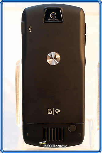 上圖是 MOTO W510 的機身背面,背面上印著「錄影機」與「記憶卡」圖示 ( 支援 micro SD 記憶卡擴充 ),可明顯的得知,即使被列為中階價位,不過在內建支援的功能卻不吝嗇。
