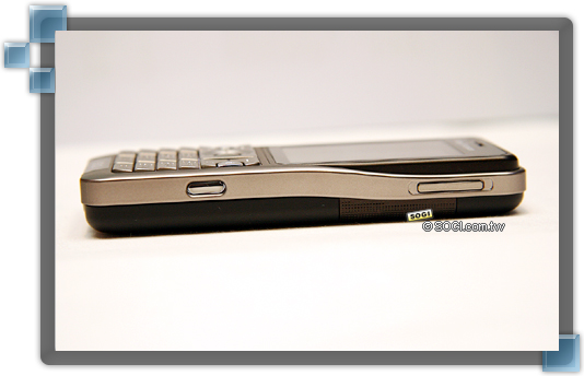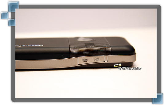 Sony Ericsson K850i 擁有約 17mm 的機身厚度,在機身側邊處便是相機橫向拍攝模式之專屬操作按鍵。這邊比較特殊的是上圖中之紅圈處,它便是上段所提到的專屬相機蓋開關,按一下開蓋進入相機拍攝模式,再按一下便闔蓋進入待機畫面。除了專屬相機蓋開關之外,在側邊處還有幾項拍攝模式操作鍵,如快門鍵、變焦、影像 / 影片 / 多媒體資料夾轉換鍵等功能。