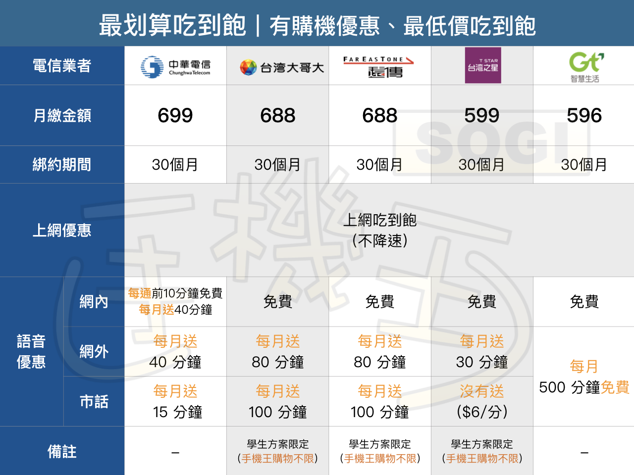 最划算吃到飽:月租 700 以下,必備吃到飽不降速,通話量中上,最適合以行動上網為主的大多數人使用!