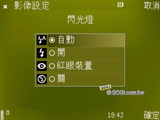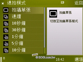 相機介面和 N85 並沒有太大的不同,N 系列的用戶想必都非常眼熟。右側的選單可供使用者調整設定,拍攝時也可選擇為隱藏。此外,場景模式提供簡單的優先設定,讓不喜歡手動調整的人能夠直接應用。閃光燈共有四種選項,包括自動、開、關和紅眼裝置。此外,連拍的選項非常多重,連續表示能夠不間斷連拍 6 張照片,也可直接按住快門鍵連續拍攝,拍到記憶體用完,其中 10 秒鐘、30 秒鐘、 1 分鐘……等選項,則是自動拍攝的時間間隔。