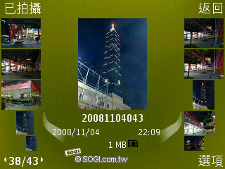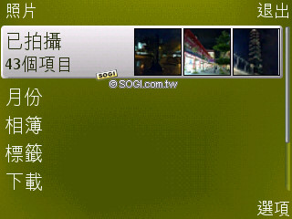 相簿支援基本的分類方式,拍攝後的相片會依據月份建檔,這部分的功能對於懶人來說相當不錯。開啟單張照片可直接選擇線上分享,發表個人文章,或是透過 MMS 多媒體簡訊的方式,傳送影像給親朋好友。此外,旋轉式的瀏覽模式,使用起來相當得心應手,只要左右切換就可以快速選擇照片,下方還備有拍攝日期、時間和檔案大小等資訊。