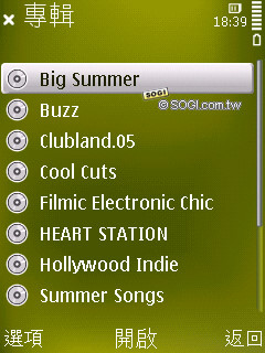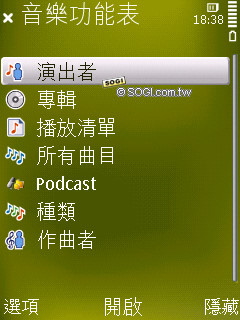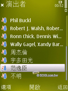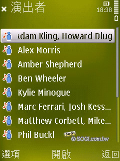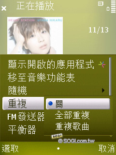 音樂播放器的功能和 N85 類似,分類介面也差不多,支援歌手、專輯、播放清單、所有曲目……等。比較值得一提的是,即便是日文專輯手機也可以清楚辨識,和 N85 一樣。另外在聽覺方面,使用者可以設定為隨機或是重複播放。