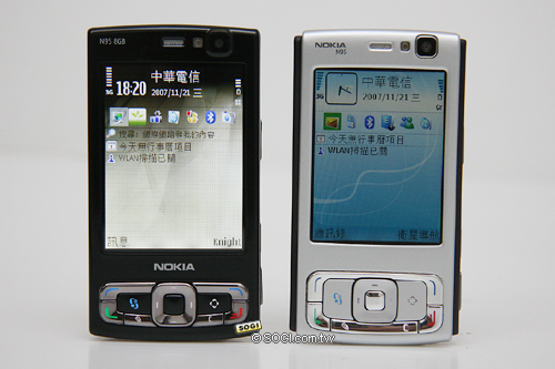 二機比較的圖片,明顯能看出 N95 8GB 螢幕範圍,比原本的 N95 大許多。N95 8GB 將原本的 2.6 吋放大為 2.8 吋,而且保持在 240 × 320 pixels、1670 萬色 TFT 液晶顯示的高規格。高彩度大視野,對於許多功能都有正面加分。