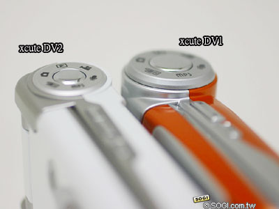 xcute DV2 與 DV1 一樣具有機身側邊的「功能選擇鍵」圓盤,操作方式與 DV1 一樣,只要要下機身側邊的功能選擇鍵,機身側邊上方的「功能選擇鍵」圓盤就會跟著顯示目前所點選的功能項目。二者唯一不同的地方在於其外觀設計,從上圖中,可以很明顯的發現 xcute DV2 的「功能選擇鍵」圓盤比 DV1 還要小,且在大小的設計上也已與機身側邊對齊為主,沒有像 DV1 那樣很明顯的凸出!