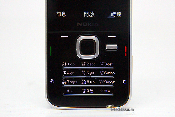首先,先比較一下上面兩張按鍵區塊圖,這是 N78 在外觀設計上最大的特色之一。採用鏡面拋光鍵盤設計的 N78,鍵盤上的功能符號與數字將會隨著螢幕畫面燈光轉暗而跟著消失,且在符號與數字消失的同時,在視覺上也僅只會呈現四排長細條形按鍵,很明顯的,這又是諾基亞大玩燈光效果的另一款設計作品,而螢幕下方的五向鍵也另有玄機,用戶可以透過 Navi 觸碰式滾盤的開啟設定,透過拇指輕輕的滑動而達到更輕鬆的功能選單操作體驗,另外,玩家也可透過開啟滾盤燈光效果設定,而在五向鍵周圍擁有如指示燈般的持續閃耀,黑暗中臨時要找手機再也不擔心會找不到。