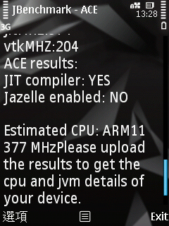 ARM 與 Jbenchmark 合作開發的測試程式「arm cpu estimator(ace)」,可測試手機的處理器與 java 效能,CPU 資訊以及圖表。測試的方法非常簡單,只要將 ACE 程式傳到手機或記憶卡當中,打開程式在手機上安裝即可。安裝完成後,打開 ACE 應用程式檔案並執行,即可就可以看到如 CPU Family、時脈與 java 效能圖表等資訊。結果顯示,LG Nokia N78 屬於 ARM11 系列,執行時脈為 377 MHz,不支援 jazelle 硬體 java 加速。