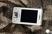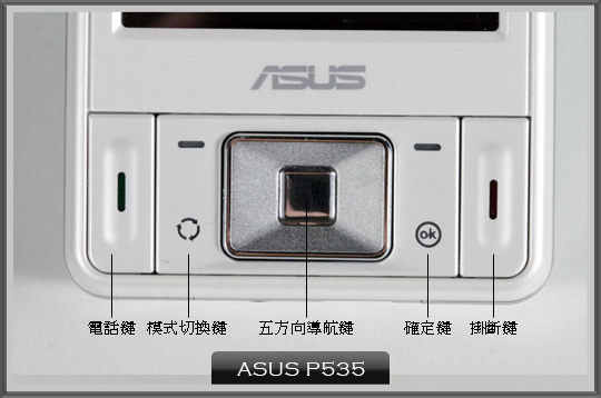 一氣呵成的按鍵!從左至右分別為電話鍵、模式切換鍵、五方向導航鍵、確定鍵及掛斷鍵。在視覺的第一印象上,就比 P525 簡潔、俐落的多,同時也和 P525 的市場區隔開來。模式切換鍵相當實用,迅速轉換桌布與其他功能的畫面,就如同 PC 上轉換的概念一樣。