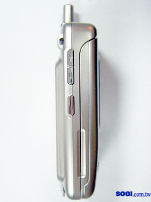 在機身的左側,有音量的控制鍵及一個功能鍵,音量控制鍵可用來調整音量的大小,下方的功能鍵可以開啟外螢幕的拍照功能,讓使用者能隨時隨地享受自拍的樂趣,在進行拍攝摸式時,按音量的+、-鍵可以調整亮度,拍攝之後,+鍵是儲存,而-鍵是刪除。該功能鍵還有一個功能就是在通話時,長按該鍵即可進行錄音。而在音量控制鍵的上方就是手機吊飾孔了。