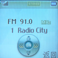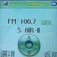 進入 M220 的收音機功能,要是沒有搭配附贈的耳機將會顯示請先插入耳機字句,插入耳機之後才能正確的進入收音機選單。首先,畫面出現的是預設的電台,還有電台名稱,要先按下中央的 ON 鍵才會有聲音,上下鍵是切換設定的電台頻道,M220 一共可設定 20 個固定頻道,左右是微調頻。