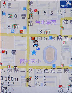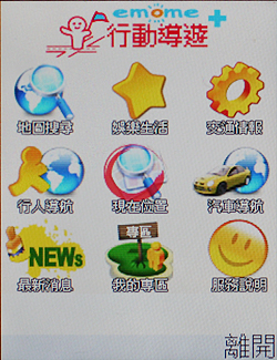 按下機身側邊 AGPS 專屬快捷鍵之後,螢幕立即開啟 AGPS 導航主功能表,如左上圖。BenQ M7 內建的 AGPS 導航功能齊全,除了具備行人與汽車模式導航之外,也支援地圖瀏覽與娛樂、交通等情報蒐集服務,城市吃喝玩樂導航,一機搞定。