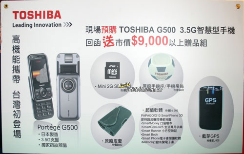 在 TOSHIBA 展區,除了展示各款 NB 產品之外,參與民眾亦可親自體驗旗下首款智慧型手機 PORTEGE G500 ( 建議售價為 19,900 元 )。比較特別的是,為了延續 TOSHIBA 筆記型電腦 22 年來行動運算的領先科技優勢,及堅持日本製造品質的優良傳統,TOSHIBA 智慧型手機將以 PORTEGE 系列命名,希望秉持此系列一向標榜的超輕薄、超可攜商品概念,打造全方位行動商務智慧手持裝置。