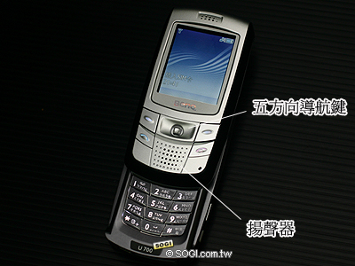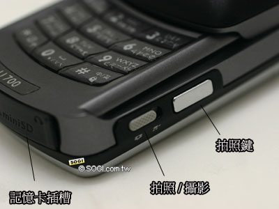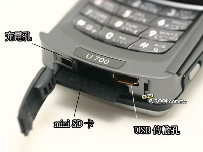 此外,在 BenQ U700 機身下方,便是支援 mini SD 記憶卡擴充槽處,在記憶卡插槽旁邊則是USB 傳輸線插孔,BenQ U700 除了可直接利用記憶卡讀取資料之外,還具備 USB 傳輸與紅外線傳輸功能。