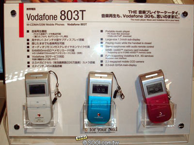 Vodafone 803T 定位在其中階 3G 手機,強調強大的音樂功能,不開蓋也能以外螢幕當作播放器,在進行其他功能的時候,也能聽音樂。 803T 支援 Vodafone 的音樂全曲下載服務,可透過 3G 高速上網來下載。而且,還可以和 iTunes 同步 AAC / AAC+ 音樂,以 USB 和電腦連結同步音樂。 Vodafone 803T 預計 10 月在日本上市。