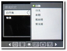 在白平衡部分則有 5 種模式可選擇,包括自動、針對白天的日光白平衡、針對夜晚的夜間白平衡另外還有鎢絲燈及螢光燈模式。