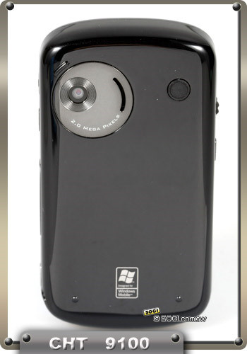 CHT9100 背面設計,除了相機鏡頭及喇叭孔之外,剩下的就是明顯的 Windows Mobile 的圖案標誌了,200 萬畫素的數位相機,但不具備自動對焦功能。