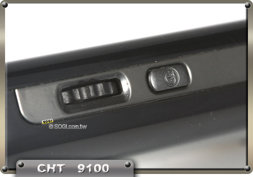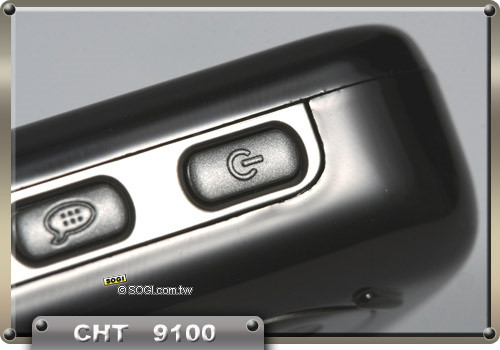 電源按鍵有別於一般手機均是與掛斷鍵結合的設計,CHT9100 將其獨立出來,並放在機身側邊,而旁邊的按鍵則是語音指令鍵,可直接用說的叫出各項功能,如直接喊電話簿就會進入其選項。