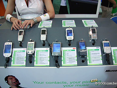 目前跟市面上許多手機廠商互有合作的微軟此次在台北國際電腦展中亦設有攤位展出,由下圖中可以發現,在微軟的展區攤位上,展示了許多款內建微軟系統的智慧型手機,且大部分都已經浮出市面了。