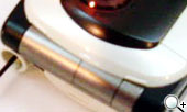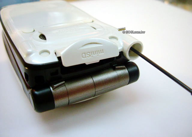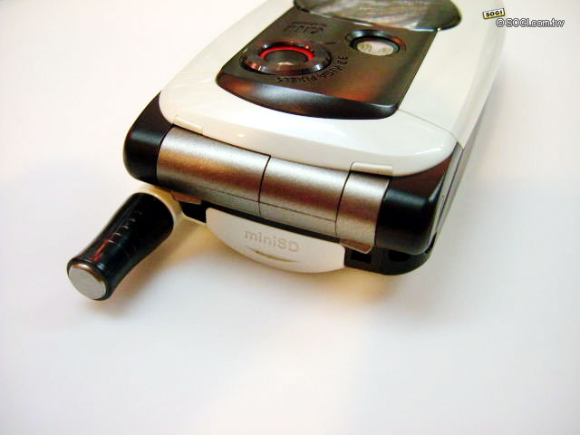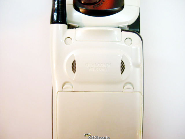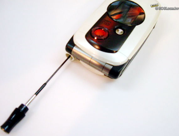大部分百萬以上畫素 CCD 的照相手機,鏡頭都會比機身突出一點,不過 A5406CA 的鏡頭幾乎是和手機平行,這就是其最精湛的設計之處,有實力的產品總是特別的低調而沉穩。葫蘆狀的黑色可拉式天線,烤漆和手機本身一樣都相當的有質感。背後有環繞音效的雙喇叭,和 A5406CA 整體設計概念一樣,並不會特別突出機身,但 64 和絃的音質卻依然精湛,也支援日本最流行的來電 MP3 鈴聲。下蓋機身的頂端為 miniSD 記憶卡槽,也是較特別之處。