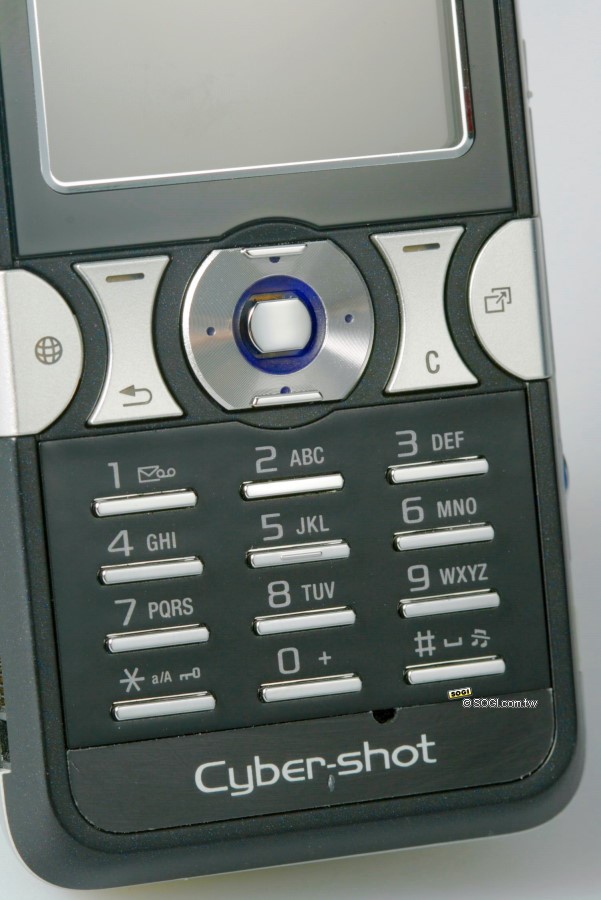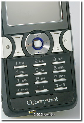 位於螢幕下方的按鍵區,其色澤相當的亮眼,讓人一眼即可注意到。此外,K550i 的數字按鍵採用與 W880i 一樣的設計,立體的金屬按鍵,成細長的條狀排列,塑造出手機外觀的獨特性。