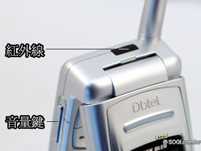 Dbtel J6 的外型介面就比較陽春一些,因為內部的鍵盤可以做相對應的功能快速鍵設定,外頭就只有紅外線,以及音量鍵,其中音量鍵,在閤蓋時長按上鍵,就可以啟動相機來自拍。