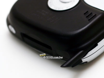 背蓋顆粒防滑設計,感覺更有設計感及金屬感。內鑲 130 萬畫素的相機,比起 DOPOD 700 更高一階。下圖則是其機身旁的按鍵,中間是音量調整鍵,左邊是相機快速鍵或是拍照鍵,右邊則是記事鍵,一直按著不放就可以進行短暫的錄音。
