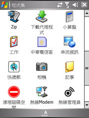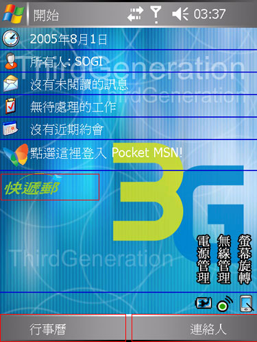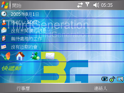 而灌上 Windows Mobile 5.0 for Pocket PC 版的 Dopod 900 的介面與以前的 2003 版差不多,比較不同的是最下面的 bar 變成了兩個很大的 hotkey,不再是「新增」文件鈕以及右下的快速控制項,這些控制項都往上提一層去了,反正螢幕夠大,管我怎麼用!!
