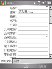 上圖就是 Dopod 900 的來電大頭貼的圖示,筆者使用 640 x 480 的圖來當大頭貼之用,但出現的卻是小之又小的圖,真是大失所望,所以要使用大點的大頭貼,還是自己裝吧!!另外 Dopod 900 還多了幾個欄位,如「立即訊息」「政府 ID」等等。