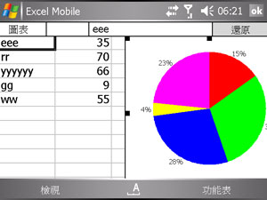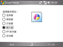 而 Windows Moblie 5.0 的新增功能當然不只是這樣,內建的 Office Mobile,Excel 功能已經進步到可以顯示「統計圖」了,不論是直條圖、橫條圖、折線圖或是圓餅圖,現在都可以在 Dopod 900 裡顯示,還可以進行編輯,也就是在手機上直接建立統計的圖表,不論是在交通中或是會議中都可以及時的更改修正圖表。這點很 SMART。