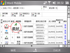 下圖左就是其 EXCEL 的範例畫面,可以自行將左邊的數值建立統計圖表,快速又方便。而內建的 Word 功能有什麼增進呢? 就是它現在可以顯示圖示以及表格了,之前 2003 的版本只能顯示字體、顏色等基本的 WORD 文件,是不能顯示圖片或是表格,現在 5.0 版的 Windows Mobile 就可以正常顯示圖片以及表格文件,如下圖右的航班查詢。