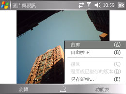 圖片瀏覽方面,比起 2003 陽春的內建程式,Windows Mobile 5.0 已經可以旋轉或是剪裁等編輯,假如不是很需要太花俏的影像編輯,內建的就夠用了,不用再裝其他多餘的程式。