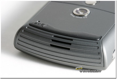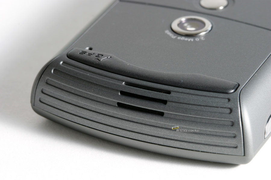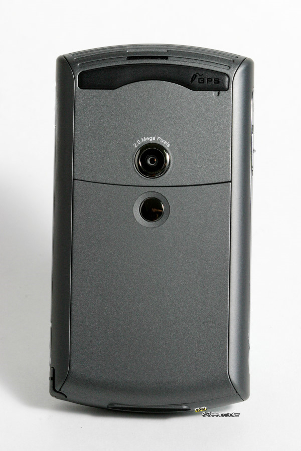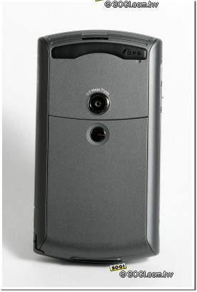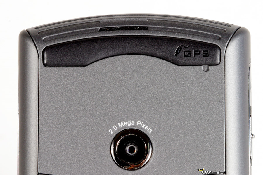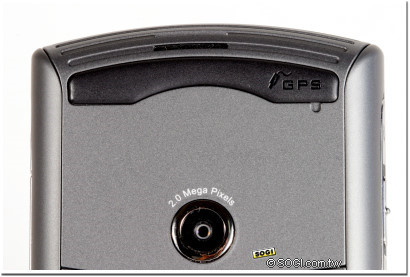 機背部份上方,有一條以橡膠包覆的防滑條,裡面隱藏著 GPS 外接天線頭,在收訊不好的地方,可以外接天線的方式,增強 GPS 的收訊功能。下方則可以看到 200 萬畫素相機鏡頭以及自拍鏡的配置。