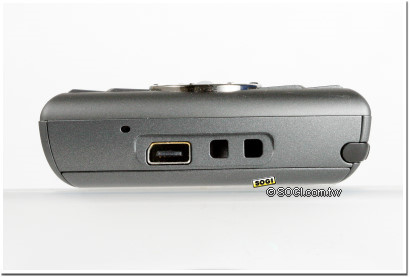 手機必備的吊飾孔, P800W 這次也將之設計在機底,可隨使用者喜好自行加掛;旁邊的 mini USB 傳輸埠,除了可以 USB 傳輸線連結至電腦同步,也支援充電及耳機連接的機制。