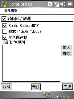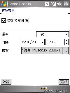 雖然說 Windows Mobile 5.0 作業系統本身不用擔心資料流失的問題,但是為了防足意外發生, P800W 也內建了備份程式,提供使用者在與電腦同步外,另一個資料備份的選擇。最特別的,在於除了簡易點選的傻瓜模式外,還可切換為進階模式做細節調整,包含欲備份資料夾的選擇、檔案加密機制、備份排程甚至是遠端備份 Server 上的資訊都可以做到,功能相當強大。