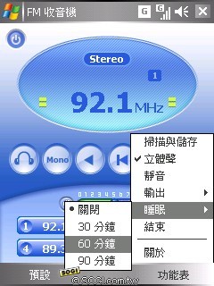 P800W 這次也內建 FM 收音機功能,彌補先前機種不支援的遺憾,不過由於天線設計在附贈的立體聲耳機上,所以欲聆聽FM廣播頻道,必須先插入 USB 耳機,才能啟用廣播功能。可以自行搜尋設定 20 組廣播頻道,也可切換以擴音喇叭播放,如果擔心電力耗損,還提供睡眠功能,可設為在 30、 60 及 90 分鐘後自動關閉功能。