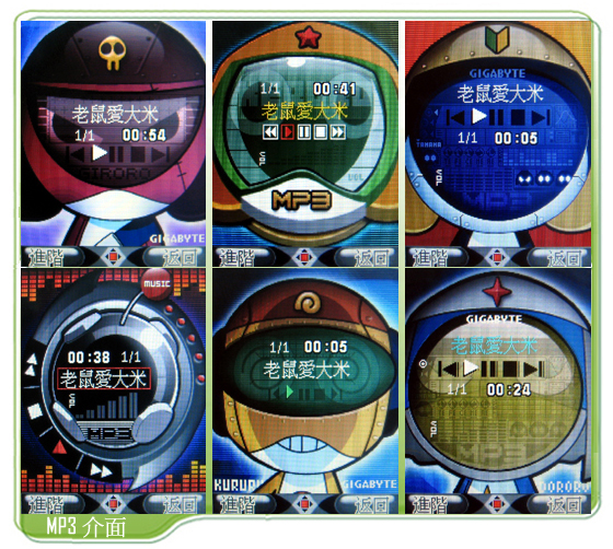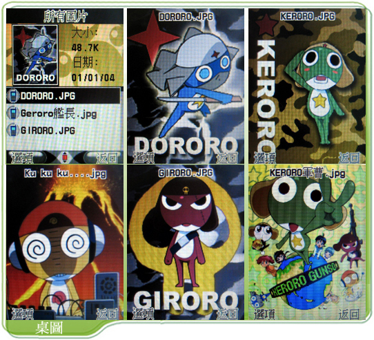 6 款「KERORO」小隊唱給你聽的 MP3 介面,使用者可以隨時更換自己喜歡的角色,包括「小隊隊長‧軍曹」Keroro、「二等兵」Tamama、「機動步兵‧伍長」Giroro、「通訊參謀‧曹長」Kululu、「暗殺兵‧兵長」Dororo共五個隊員,另外,還有軍曹的武器「Kero 球」專屬介面喔!