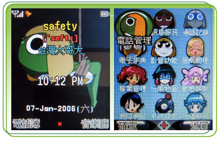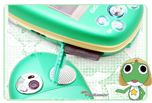 軍曹專用機延續 GigaByte g-re內建 130 萬畫素鏡頭,包括近拍、自拍鏡與閃光燈功能應有盡有,還可搭配 12 款 KERORO 相框,就好像 keroro 隊員隨時陪著你,看到那可愛的臉孔,對於軍曹迷實在是毫無免疫力!