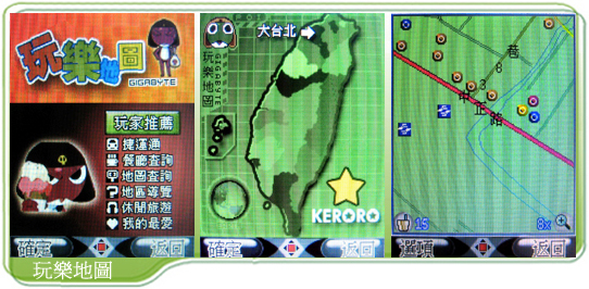 內建玩樂資訊據點提供功能是 GIGABYTE 手機的一項獨門絕招,將全台重要景點、餐廳與地圖等,設計存在手機裡,方便使用者瀏覽,就不會有迷路或是不知道該去哪的煩惱囉!當然,玩樂地圖也是特地更改過軟體,讓可愛的軍曹、二等兵或是伍長陪伴你全台走透透。 對於喜愛四處吃吃喝喝、玩樂的消費者來說,這實在是一項值得稱許的功能之一。
